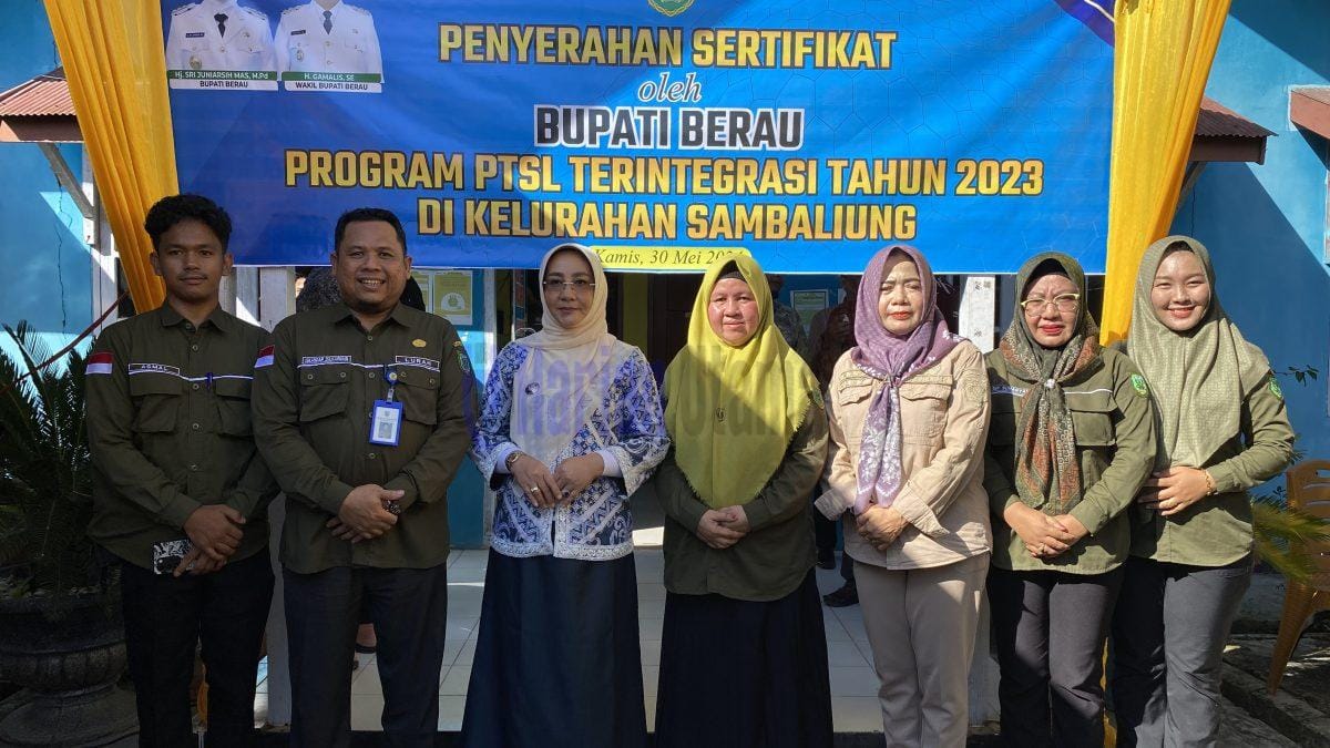 TANJUNG REDEB, Harian Utama – Bupati Berau, Sri Juniarsih Mas menyerahkan secara Simbolis sertifikat tanah Pendaftaran Tanah Sistematis Lengkap (PTSL) Tahun Anggaran 2023 yang dilaksanakan di Kantor Lurah Sambaliung , pada Kamis (30/05/2024).
