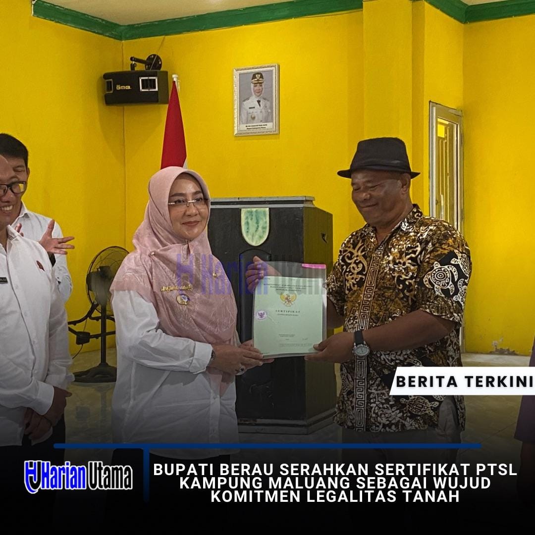 TANJUNG REDEB, Harian Utama – Bupati Berau, Sri Juniarsih Mas serahkan Sertifikat Pendaftaran Tanah Sistematis Lengkap Kampung Maluang Tahun Anggaran 2023 di Balai Kampung Maluang, pada Rabu (22/05/2034).