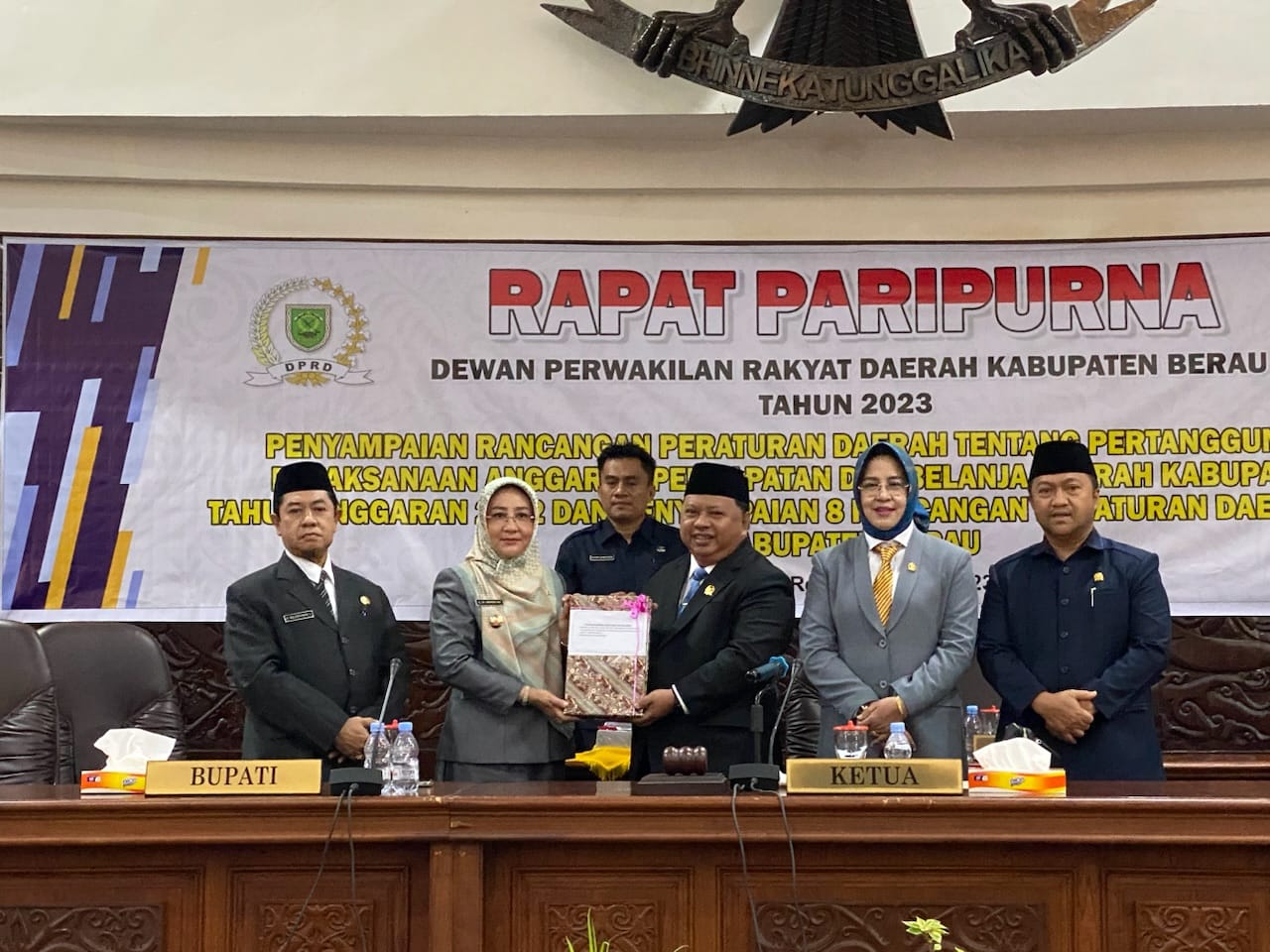 Rapat paripurna ditutup dengan penyerahan berkas raperda dan pertanggungjawaban pelaksanaan anggaran pendapatan belanja daerah Kabupaten Berau tahun anggaran 2022 oleh Bupati Berau Sri Juniarsih kepada Ketua DPRD Madri Pani.
